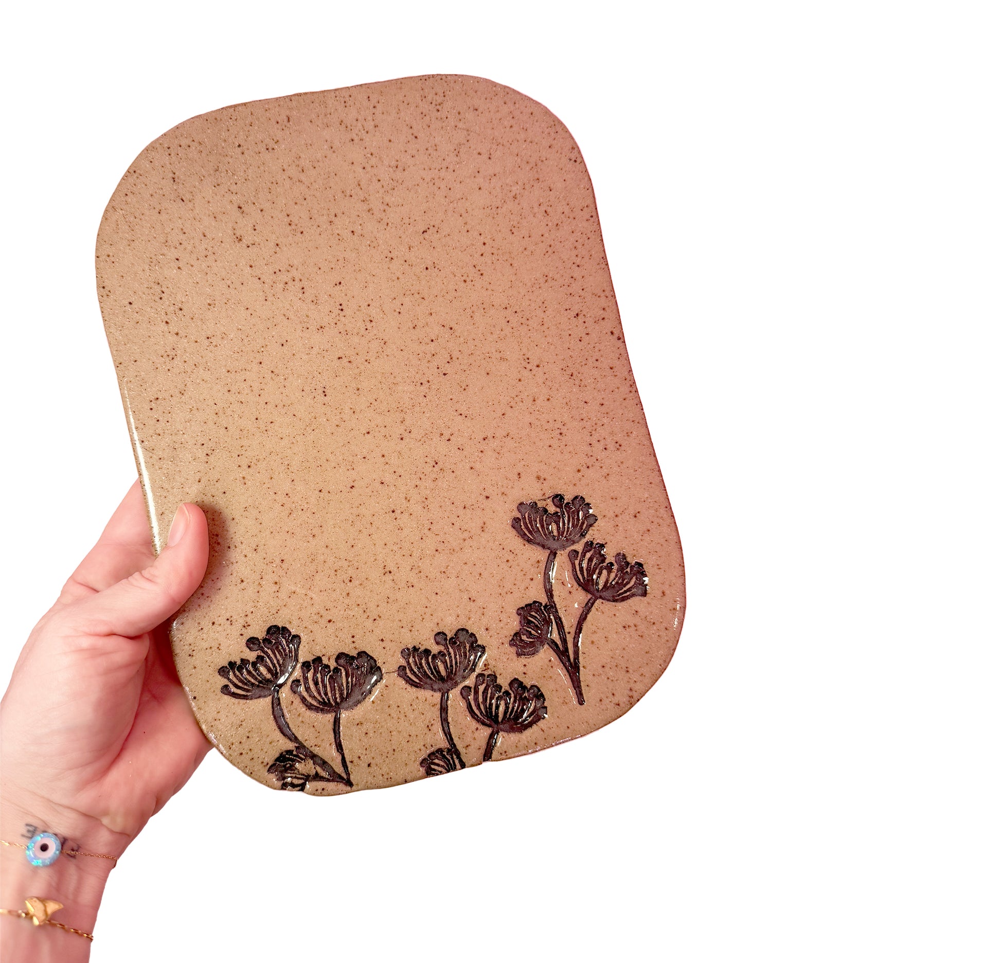 These brown speckled cheese plates are a must have for all kitchens. They are hand made using brown speckled clay. They are then coated with 3 coats of glaze and once fired the speckles in the clay push through!